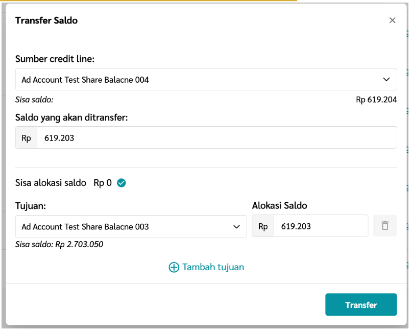 - Saldo yang akan ditransfer : Dapat diisi maksimal nominal yang dimiliki saldo akun iklan sumber dikurangi Rp1.
