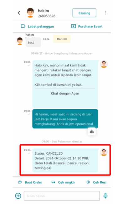 - Klik tombol ‘Cek Resi’ pada bagian bawah chat room.