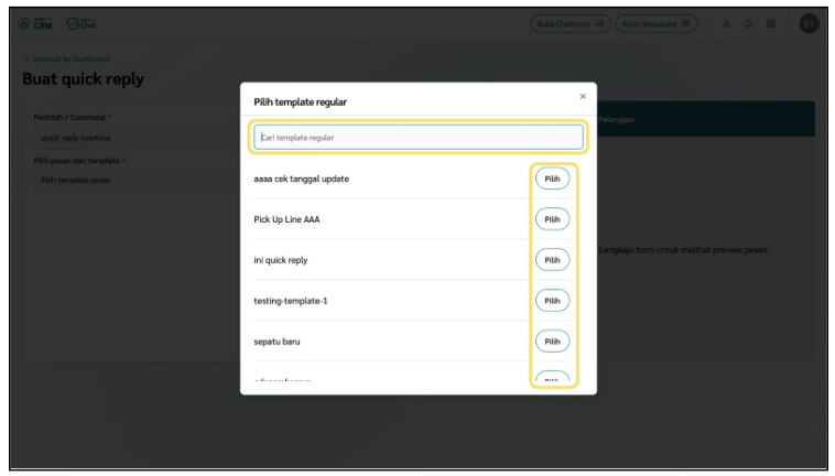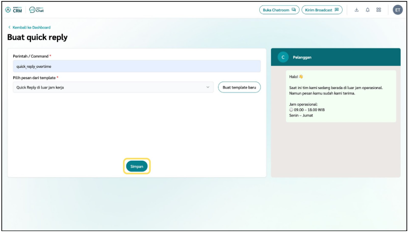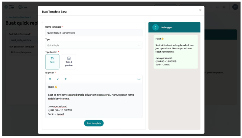 6. Klik Buat Template. Template yang baru dibuat akan otomatis terpilih sebagai quick reply.