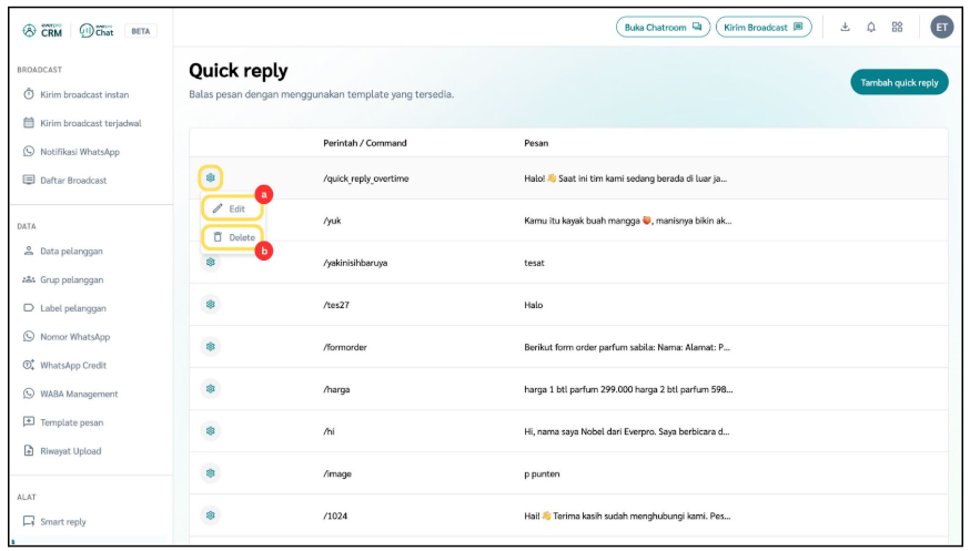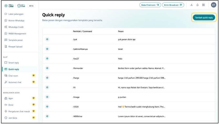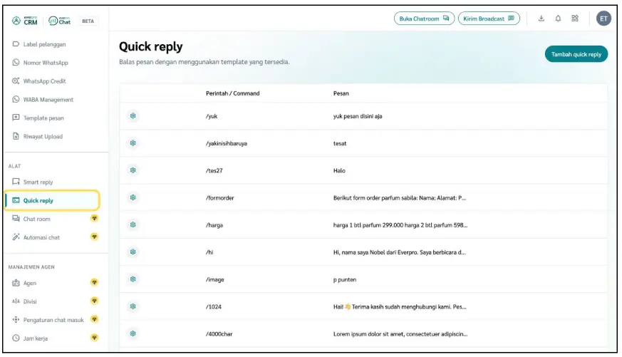 3. Di halaman ini, kamu dapat melihat daftar seluruh quick reply yang telah dibuat, lengkap dengan perintah/command dan isi template pesannya.