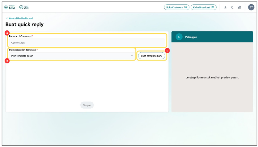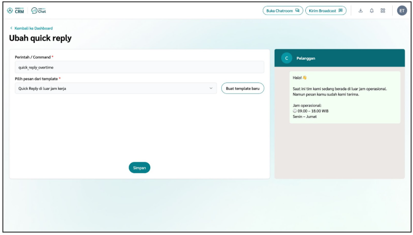 Quick Reply adalah fitur yang membantu kamu membalas pesan lebih cepat dengan mengetik kata singkat (contoh: /hi, /harga) untuk menampilkan pesan lengkap yang sudah disiapkan.
