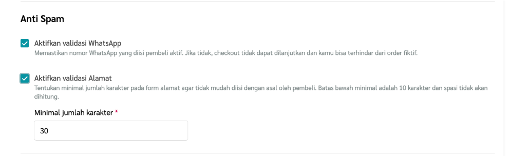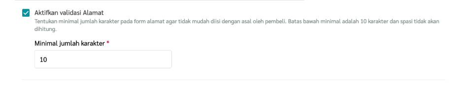 6. Pilih Aktifkan validasi Alamat, jika kamu ingin pelanggan terblokir dan menerima pesan error bila tidak memenuhi jumlah minimum karakter ketika memasukkan alamat. Aturan validasinya adalah sebagai berikut: