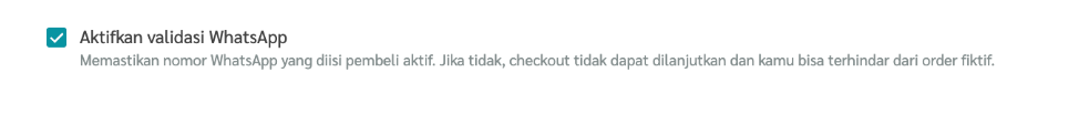 5. Pilih Aktifkan Validasi WhatsApp, jika kamu menginginkan pelanggan terblokir dengan pesan error jika nomor WA yang dimasukkan tidak valid.