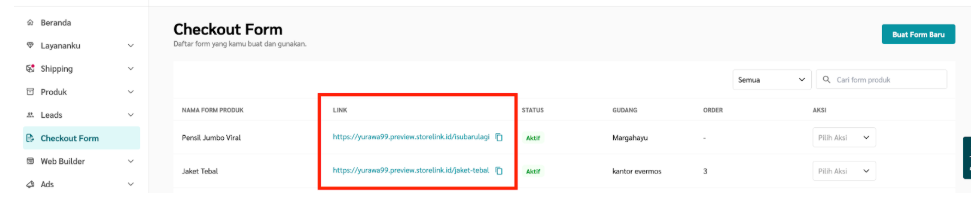 a. Buka menu Checkout Form, kamu dapat mengakses link pada kotak merah sesuai di gambar