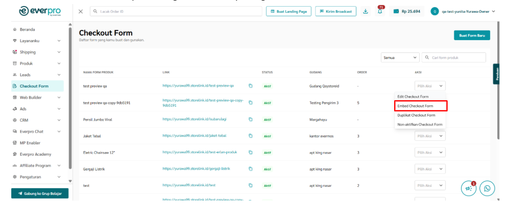 b. Kamu juga dapat melakukan embed Checkout Form dengan memilih menu Embed Checkout Form pada bagian Aksi seperti gambar dibawah ini
