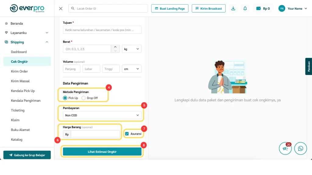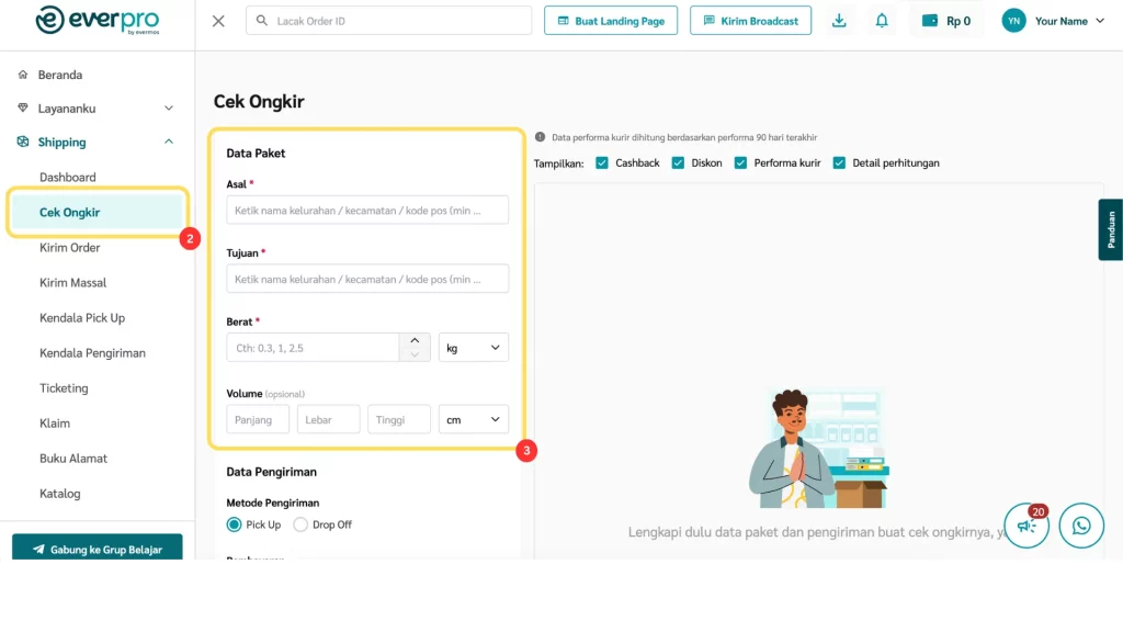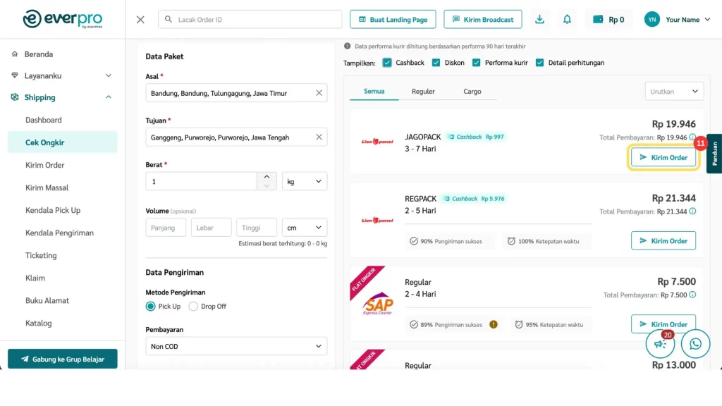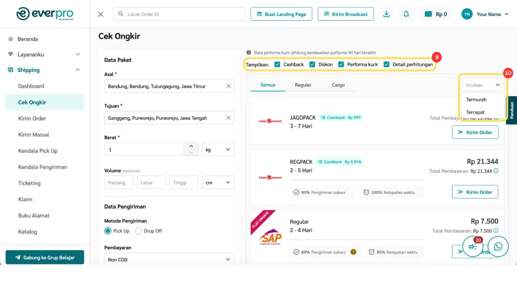 Fitur Cek Ongkir di dashboard Everpro memudahkan kamu untuk mengecek ongkos kirim dari berbagai kurir, baik untuk metode pembayaran Non COD, serta langsung membuat pesanan berdasarkan hasil pengecekan.