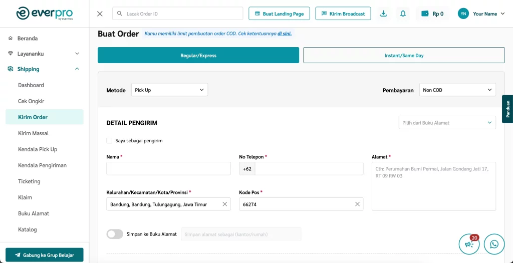 Setelah selesai melakukan pengecekan ongkir Non COD, kamu bisa langsung membuat pesanan tanpa harus mengisi ulang data dari awal. Caranya cukup sederhana.