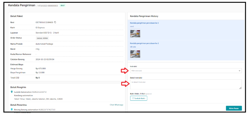 - Detail instruksi: Isi detail instruksi yang diberikan dan sesuai dengan kendala gagal kirimnya.