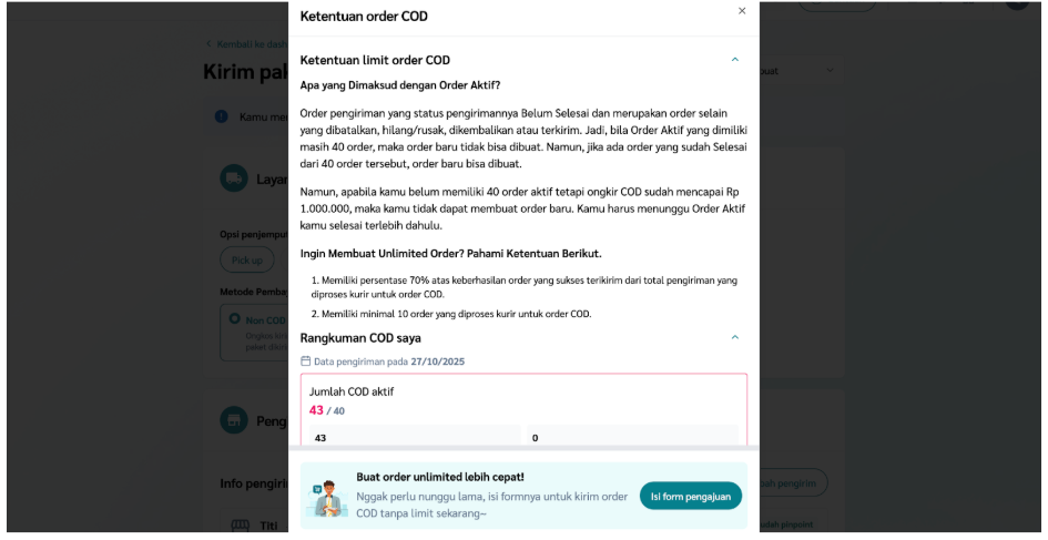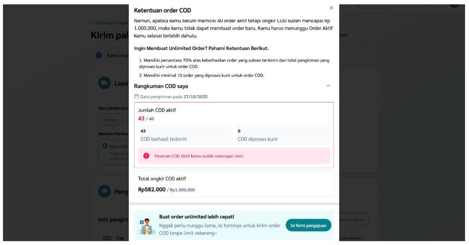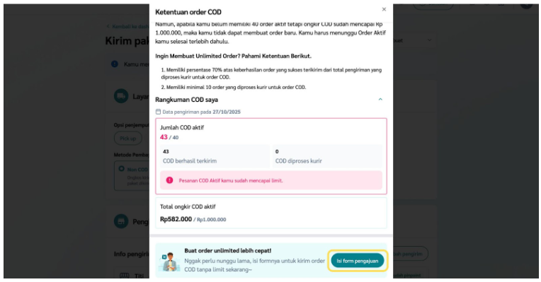 - Anda memiliki 35 order COD aktif dengan total ongkir Rp 950.000 → Masih bisa membuat order baru.