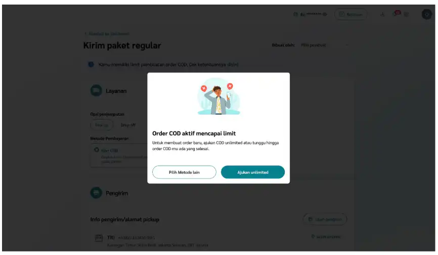 Saat membuat order baru, peringatan akan muncul apabila limit COD sudah tercapai, dan Anda tidak dapat melanjutkan pembuatan order COD.