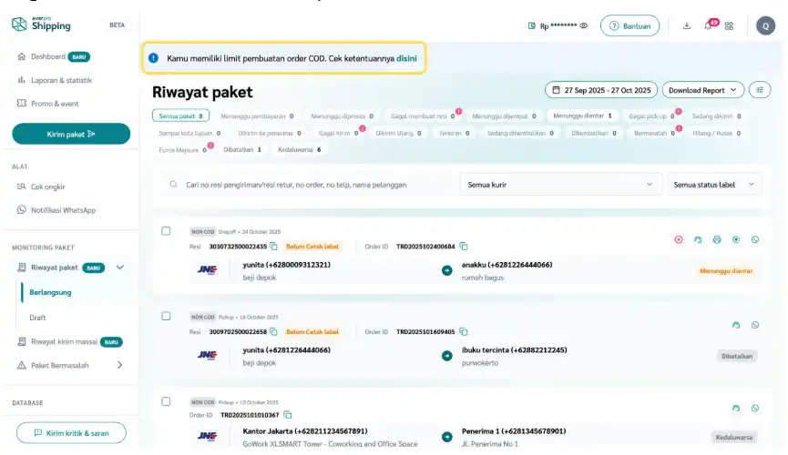 Sistem akan menampilkan notifikasi jika jumlah order COD aktif atau total ongkir COD aktif sudah mencapai batas.