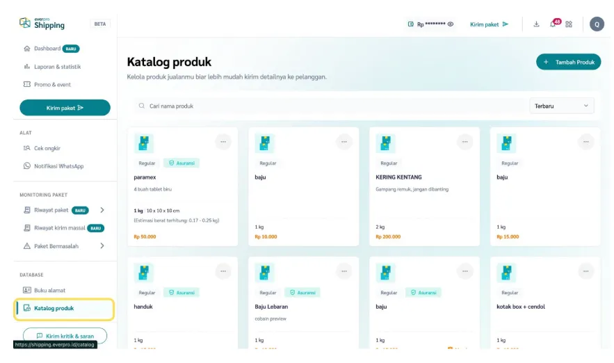 1. Login ke dashboard Shipping, pilih menu Katalog Produk.