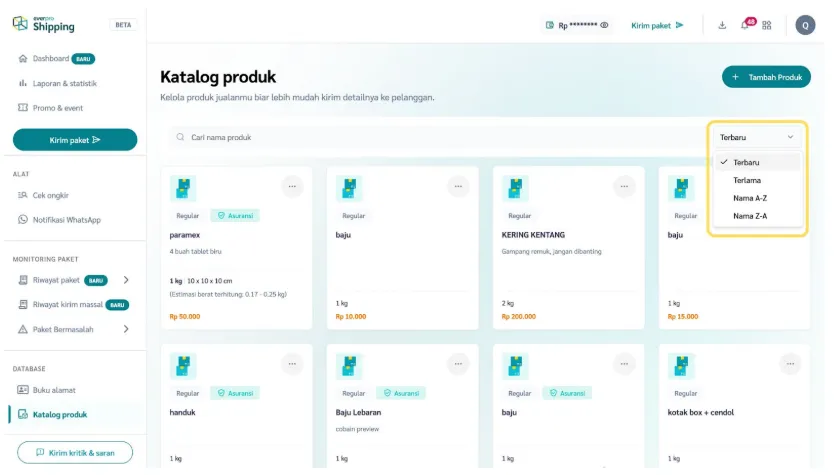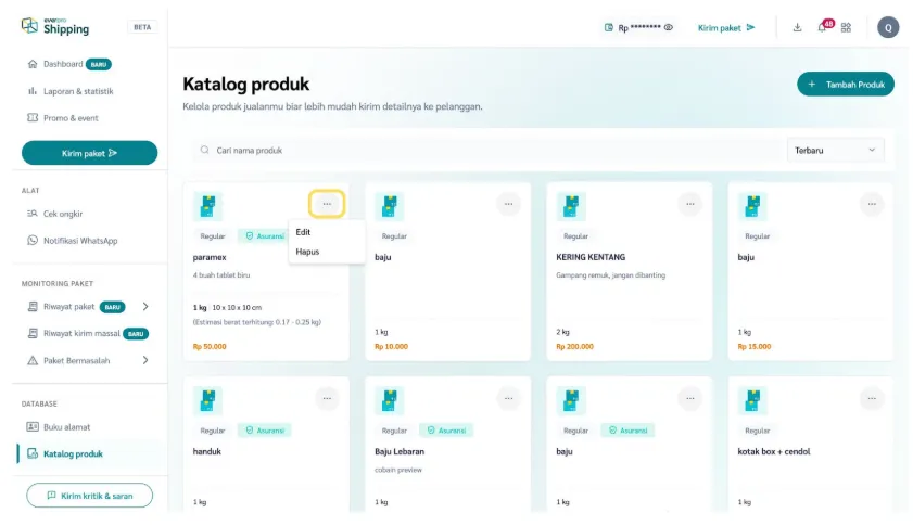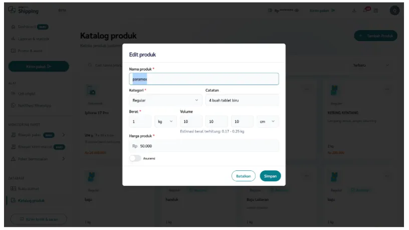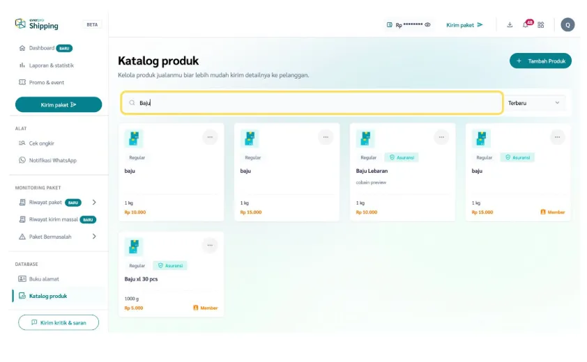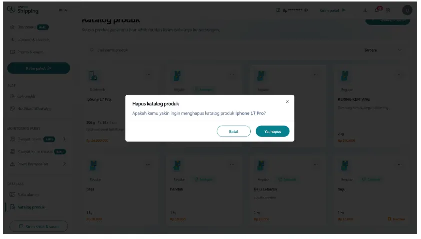 Menu ini menampilkan daftar produk yang telah kamu simpan dalam katalog. Melalui fitur ini, kamu dapat mencari, menyortir, mengedit, atau menghapus produk sesuai kebutuhan. Dengan adanya katalog, pengelolaan barang yang akan dikirim menjadi lebih teratur dan mudah diakses.