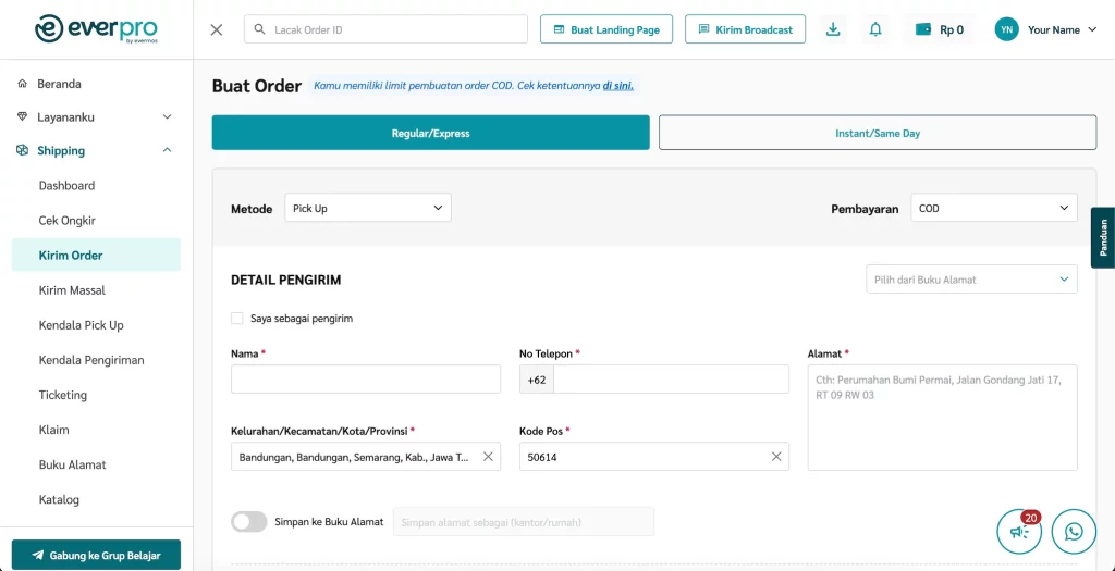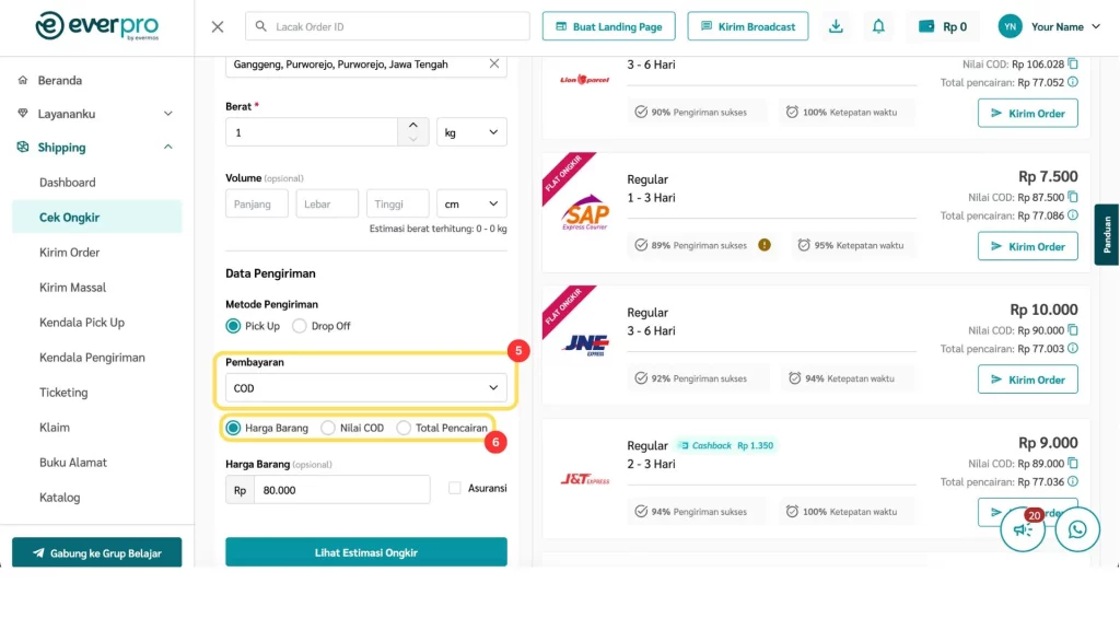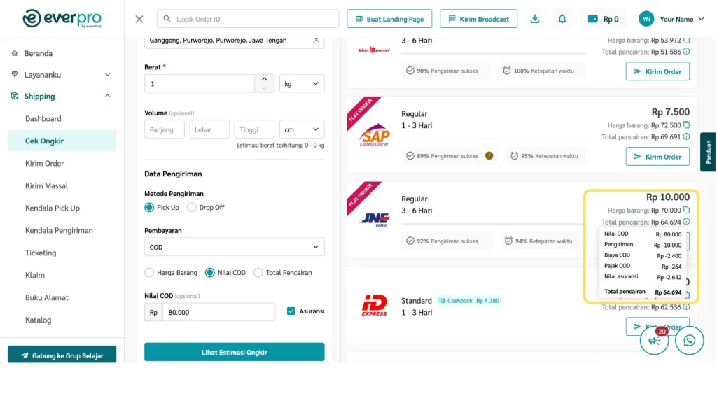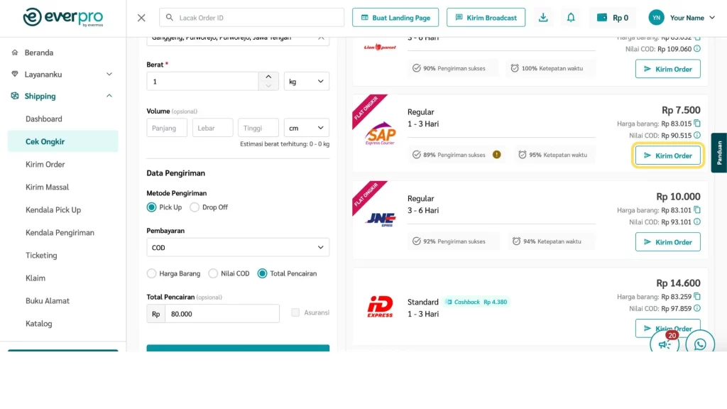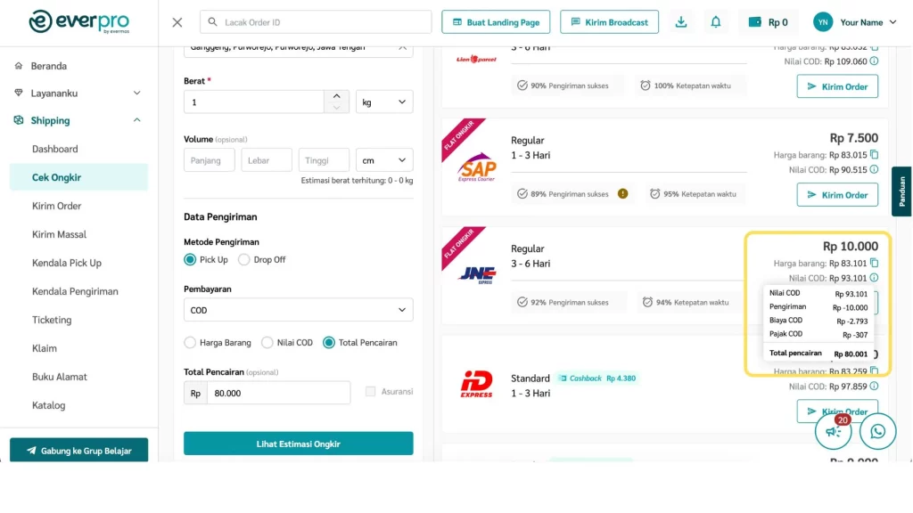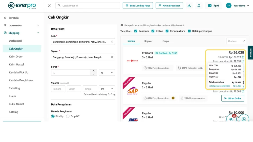 Fitur Cek Ongkir di dashboard Everpro memudahkan kamu untuk mengecek ongkos kirim dari berbagai kurir, baik untuk metode pembayaran COD, serta langsung membuat pesanan berdasarkan hasil pengecekan.