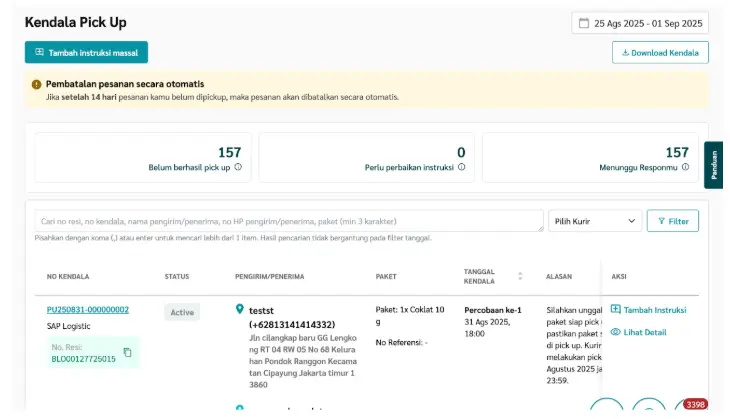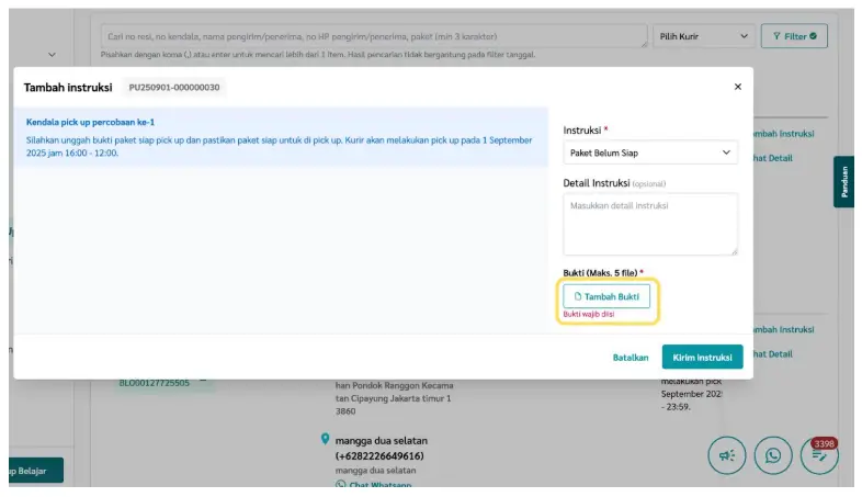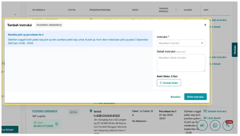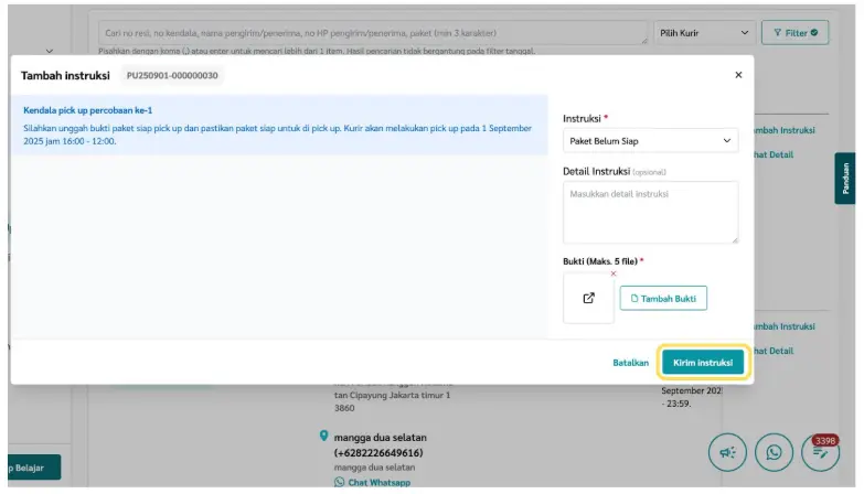a. Instruksi → pilih jenis instruksi dari dropdown (contoh: Batalkan/Cancel Paket, Jadwalkan Pick Up, Paket Belum Siap, Paket Sudah Siap Pick Up, dll).