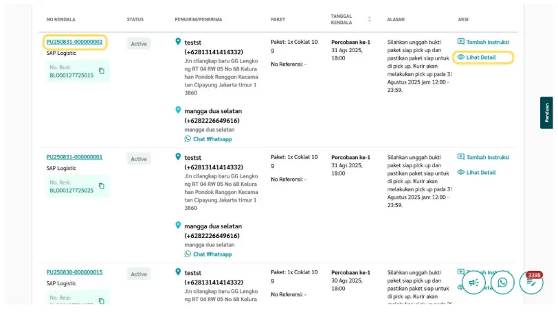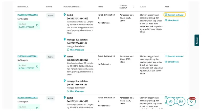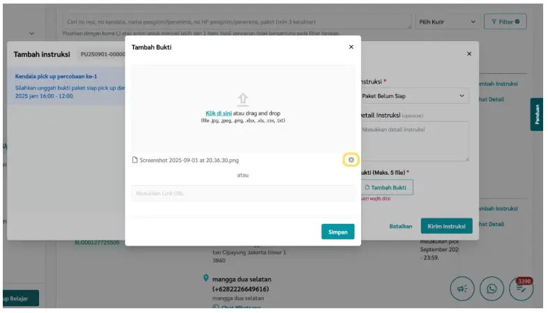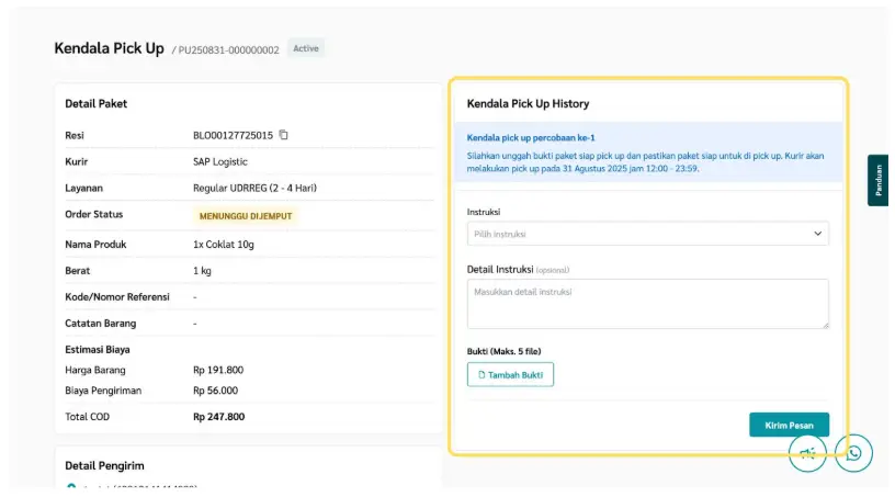 Fitur ini memungkinkan kamu memberikan instruksi tambahan atau perbaikan pada tiket kendala pick up, seperti memperbarui alamat, menambahkan detail lokasi, atau memberikan catatan khusus untuk kurir. Dengan instruksi yang lebih jelas, peluang paket berhasil dijemput akan lebih tinggi dan proses pengiriman dapat berjalan lancar.