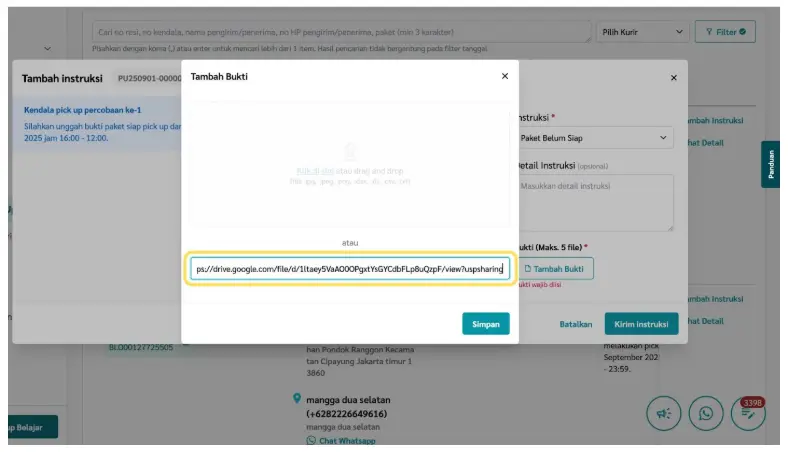 b. Detail Instruksi → opsional, dapat diisi keterangan tambahan terkait kondisi paket.