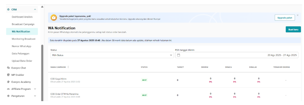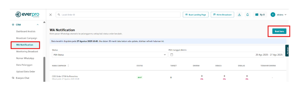 Klik menu CRM, pilih sub-menu Monitoring Broadcast dari dropdown yang muncul. Di halaman ini, kamu akan melihat daftar semua broadcast yang udah kamu buat.