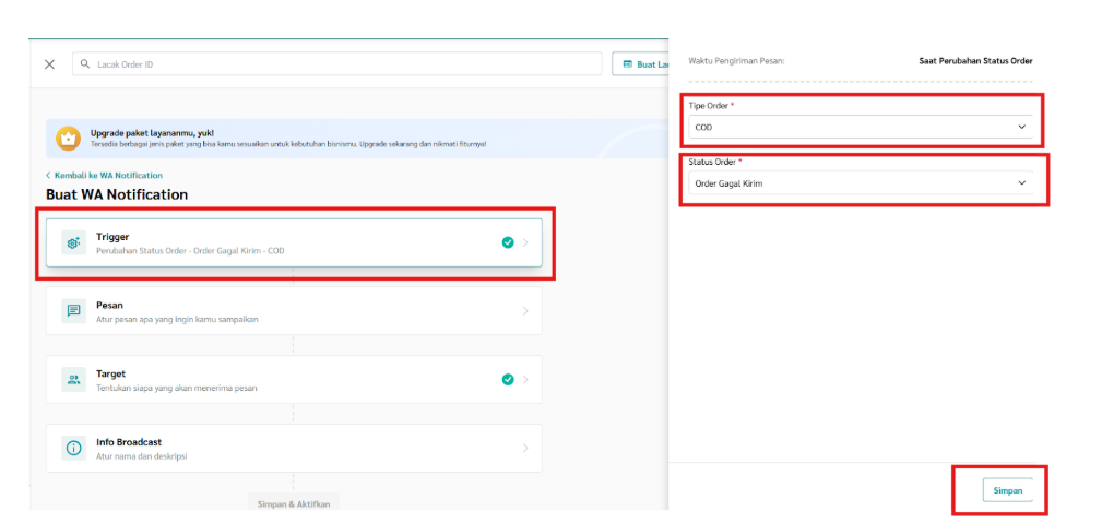 Di menu Trigger, pilih tipe order yang ingin digunakan (COD atau Non-COD). Setelah itu, pilih Status Order sesuai kebutuhanmu, lalu klik Simpan untuk lanjut ke tahap berikutnya.