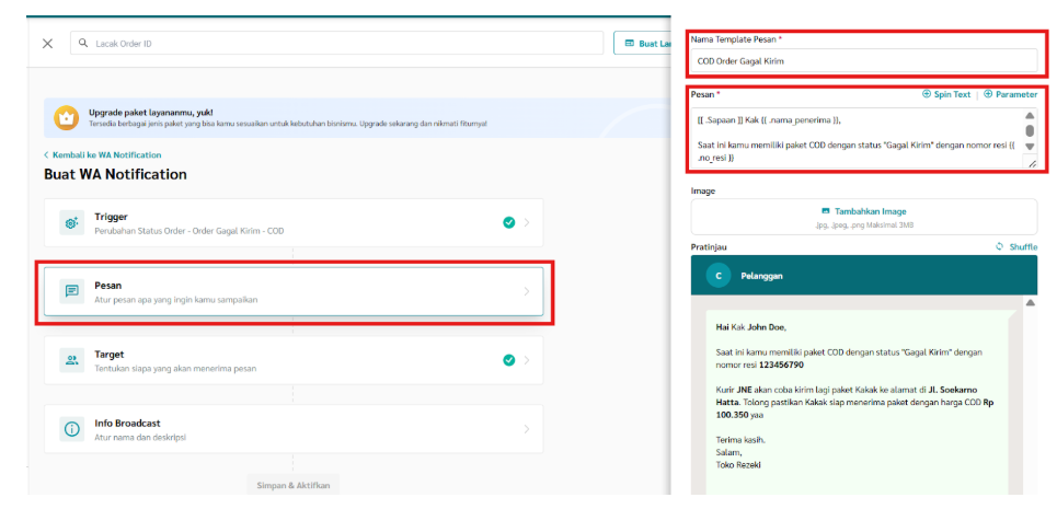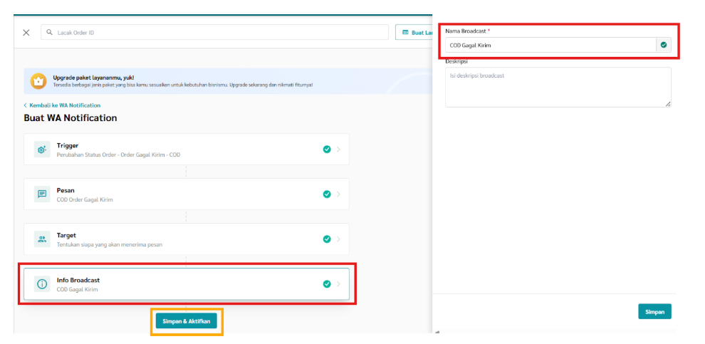 Jika semua data sudah terisi, klik tombol Simpan & Aktifkan. Sistem akan otomatis mengirimkan pesan ke pelanggan sesuai status pesanan mereka.